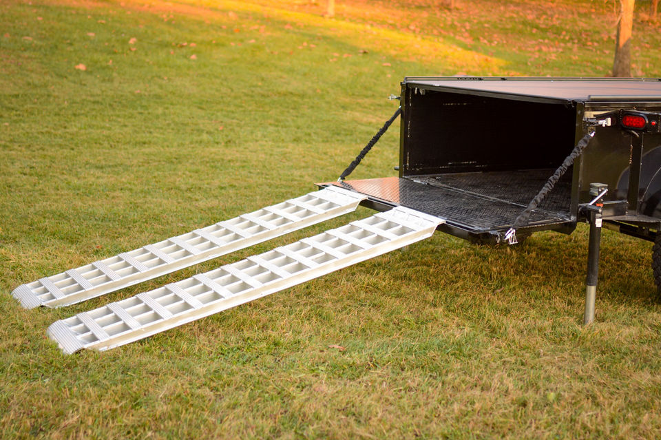 Our Ramps are custom made for SUT by Gen Y Hitch. Made of lightweight aluminum for easy handling and durability. They store easy in the channels provided in our trailer. They are 80 inches long and 18 inches wide, giving you confidence when loading your mower, motorcycle or refrigerator. Rung spacing has been reduced to 2 inches so you can use a dolly to load or unload furniture or appliances as well. Rated at 1000 LBs each they can handle anything you could load into your SUT. They have a large hook designed to attach securely to the tailgate of your trailer when loading equipment. They are also reversable if you want to use them to load items to back of a pickup truck. In a pinch they can be used as traction board or help bridge a small rut.